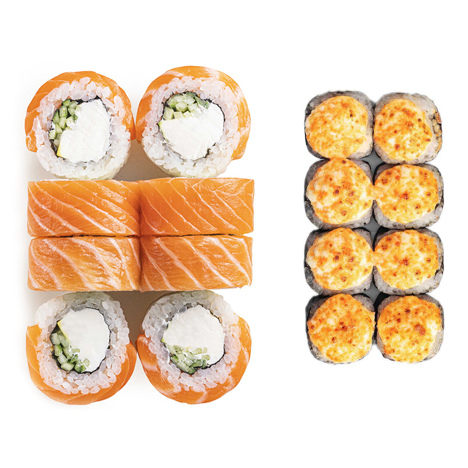 Запеченный хосомак с лососем (лосось, рис, нори, сырная шапочка).
