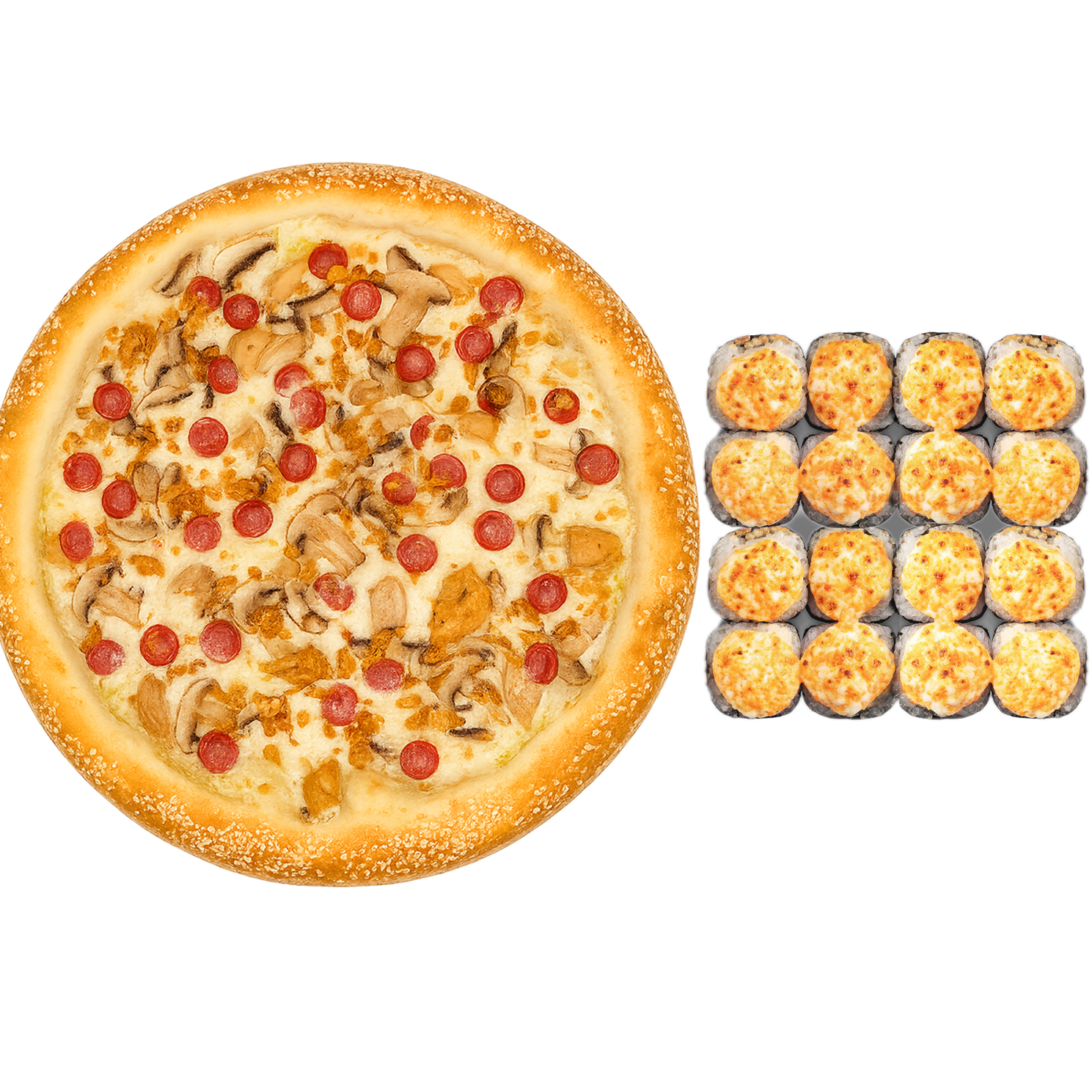 Пицца "Охотничья" (30см): охотничьи колбаски, куриное филе, шампиньоны, хрустящий лук, сыр "Моцарелла", чесночная основа;