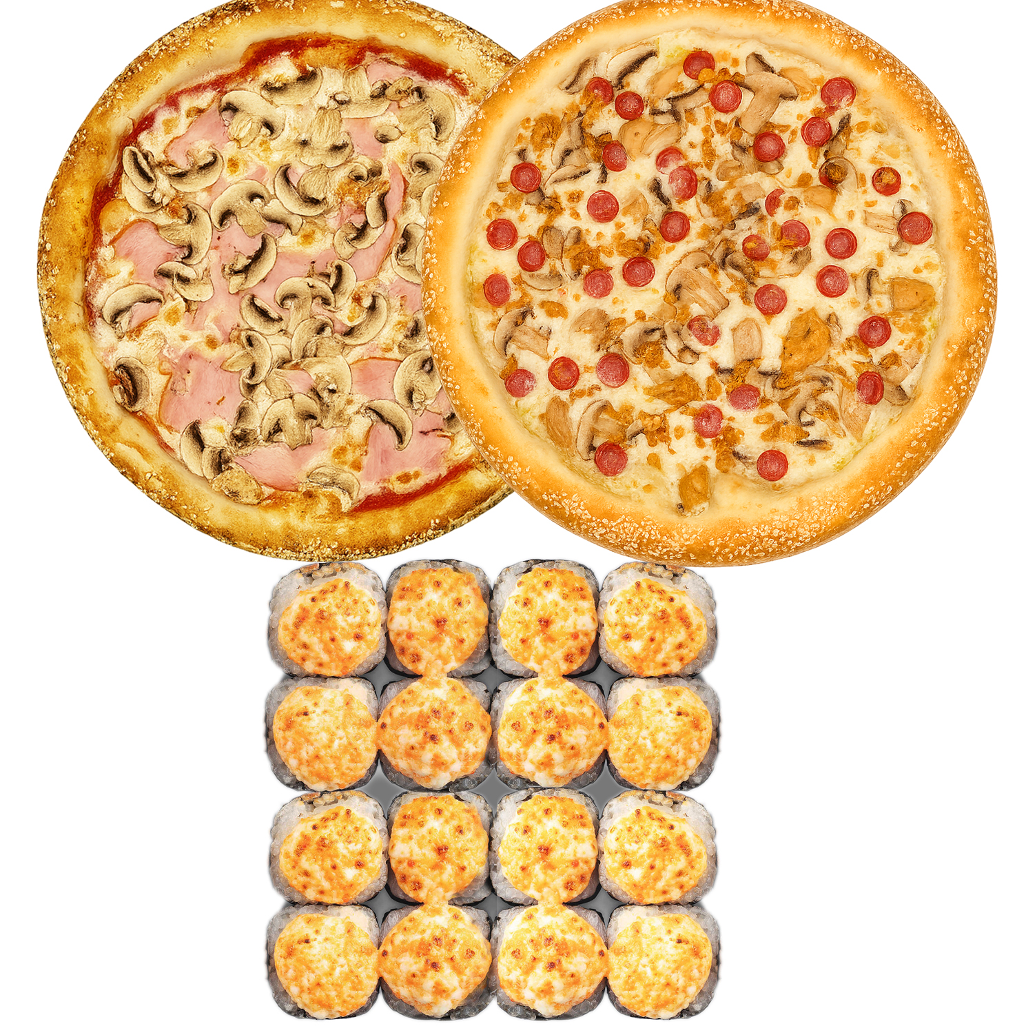 Запеченая креветка (креветка, сливочный сыр, рис, нори, сырная шапочка);