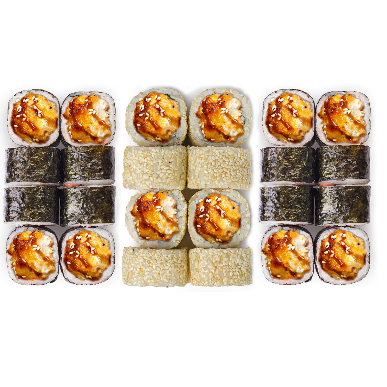 Запеченный унаги маки: угорь, сливочный сыр, такуан, рис, нори, кунжут;
